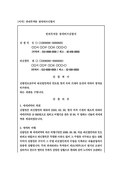 주요내용 : 변제목적물이 공탁에 부적합하거나 멸실 훼손우려, 과다한 비용 발생하는 등의 상황에서 법원의 허가를 받아 그 물건을 경매하거나 시가로 팔아 대금으로 채무를 변제하기 위한 목적으로 사용되어지는 신청서 양식임. 단 무단전재 방지목적으로 PDF 파일로 올리니, 구매하신 후 혹 원본 파일이 필요하신 분들은 톡이나 문자, 메일, 전화 등을 주시면 작성방법 등에 대한 간단한 무료상담과 함께 원본 파일을 보내드리도록 하겠습니다.