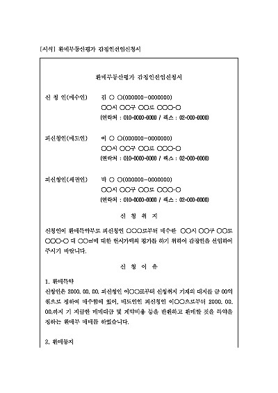 주요내용 : '환매권'을 행사할 때, 해당 부동산의 정당한 가격(환매금액)을 객관적으로 산정하기 위해 법원이나 관련 기관에 감정평가 전문가를 선임해 줄 것을 요청할 때 사용되어지는 신청서 양식임. 단 무단전재 방지목적으로 PDF 파일로 올리니, 구매하신 후 혹 원본 파일이 필요하신 분들은 톡이나 문자, 메일, 전화 등을 주시면 작성방법 등에 대한 간단한 무료상담과 함께 원본 파일을 보내드리도록 하겠습니다.