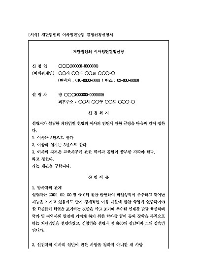 주요내용 : 재단법인의 설립 또는 정관 변경 시 이사를 어떻게 임명하고 면직할지에 대한 구체적인 규정(방법)을 정관에 명시하고, 이를 주무관청에 제출하여 허가받기 위해 사용되어지는 신청서 양식임.단 무단전재 방지목적으로 PDF 파일로 올리니, 구매하신 후 혹 원본 파일이 필요하신 분들은 톡이나 문자, 메일, 전화 등을 주시면 작성방법 등에 대한 간단한 무료상담과 함께 원본 파일을 보내드리도록 하겠습니다.
