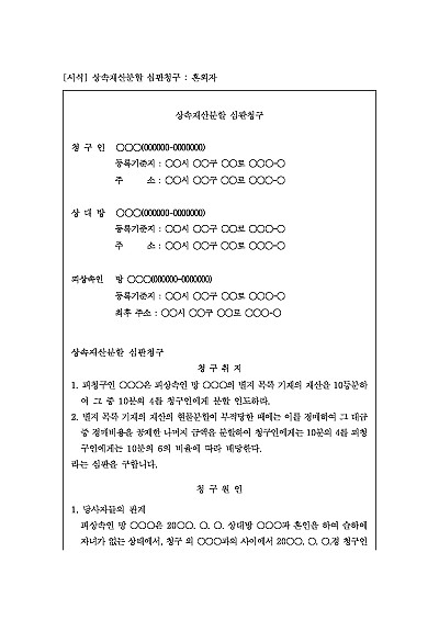주요내용 공동상속인들 간에 피상속인(사망자)의 재산을 어떻게 나눌지 협의가 되지 않을 때, 법원(가정법원)에 재산 분할을 요청할 때 사용되어지는 청구서 양식임단 무단전재 방지목적으로 PDF 파일로 올리니구매하신 후 혹 원본 파일이 필요하신 분들은 톡이나 문자메일전화 등을 주시면 작성방법 등에 대한 간단한 무료상담과 함께 원본 파일을 보내드리도록 하겠습니다.