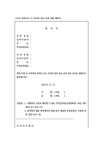 주요내용 :원칙적으로 부(父)의 성과 본을 따르는 자녀의 성과 본을, 부모가 협의하여 모(母)의 성과 본을 따르게 할 때 제출하는 문서 양식임. 단 무단전재 방지목적으로 PDF 파일로 올리니, 구매하신 후 혹 원본 파일이 필요하신 분들은 톡이나 문자, 메일, 전화 등을 주시면 작성방법 등에 대한 간단한 무료상담과 함께 원본 파일을 보내드리도록 하겠습니다.