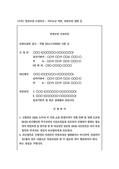 주요내용 이혼 소송 중 자녀를 양육하지 않는 부모가 상대방 양육자의 악의적 방해로 자녀를 만나지 못할 때, 본안 판결이 나기 전이라도 법원에 임시로 면접교섭을 허용해달라고 신청할 때 사용되어지는 신청서 양식임단 무단전재 방지 목적으로 PDF 파일로 올리니구매하신 후 혹 원본 파일이 필요하신 분들은 톡이나 문자메일전화 등을 주시면 작성 방법 등에 대한 간단한 무료 상담과 함께 원본 파일을 보내드리도록 하겠습니다.