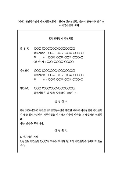 주요내용 : 이혼소송이나 친권관련 소송이 진행되는 동안 자녀의 복리를 위하여 친권자가 자녀에 대한 권리 행사를 하지 못하도록 법원의 임시결정을 구하기 위한 목적으로 사용되어지는 신청서 양식으로, 친권자의 친권 행사를 정지시키고 대행자를 선임하여 자녀를 양육하게 하는 등의 조치를 말함. 단 무단전재 방지 목적으로 PDF 파일로 올리니, 구매하신 후 혹 원본 파일이 필요하신 분들은 톡이나 문자, 메일, 전화 등을 주시면 작성 방법 등에 대한 간단한 무료 상담과 함께 원본 파일을 보내드리도록 하겠습니다.