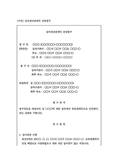 주요내용 : 피상속인이 상속인을 남기지 않고 사망하였을 때 평소 피상속인을 돌보는 자들이 피상속인의 유지를 받들기 위한 목적으로 상속재산관리인 선임청구를 할 때 사용되어지는 청구서 양식임. 단 무단전재 방지 목적으로 PDF 파일로 올리니, 구매하신 후 혹 원본 파일이 필요하신 분들은 톡이나 문자, 메일, 전화 등을 주시면 작성 방법 등에 대한 간단한 무료 상담과 함께 원본 파일을 보내드리도록 하겠습니다.