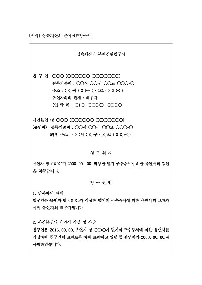 주요내용 : 유언자의 사후에 유언의 위조 및 변조를 방지하고 그 존재와 형식적 상태를 확인하기 위해 가정법원에 제출하는 공식적인 절차로서, 이는 유언 내용의 진위 여부나 효력을 판단하는 것은 아니며, 단지 유언서 자체의 상태를 확인하고 증거를 보존하는 목적으로 사용되어지는 청구서 양식임. 단 무단전재 방지 목적으로 PDF 파일로 올리니, 구매하신 후 혹 원본 파일이 필요하신 분들은 톡이나 문자, 메일, 전화 등을 주시면 작성 방법 등에 대한 간단한 무료 상담과 함께 원본 파일을 보내드리도록 하겠습니다.