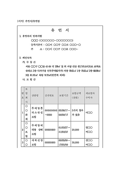 주요내용 사람이 사망한 뒤 법적 효력이 발생하는 문서로, 재산 상속, 유언 집행 등 자신의 뜻을 남기기 위해 민법이 정한 엄격한 방식에 따라 작성해야 법적 효력을 인정받는 '유언(遺言)'을 기록하는 양식임단 무단전재 방지 목적으로 PDF 파일로 올리니구매하신 후 혹 원본 파일이 필요하신 분들은 톡이나 문자메일전화 등을 주시면 작성 방법 등에 대한 간단한 무료 상담과 함께 원본 파일을 보내드리도록 하겠습니다.