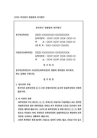주요내용 : 후견인이 피후견인에 대한 후견인의 역할을 할 수 없는 불가피한 상황이 발생할 경우 피후견인의 복지를 위하여 법원에 동인의 입양허가를 받기 위한 목적으로 사용되어지는 청구서 양식임. 단 무단전재 방지 목적으로 PDF 파일로 올리니, 구매하신 후 혹 원본 파일이 필요하신 분들은 톡이나 문자, 메일, 전화 등을 주시면 작성 방법 등에 대한 간단한 무료 상담과 함께 원본 파일을 보내드리도록 하겠습니다.