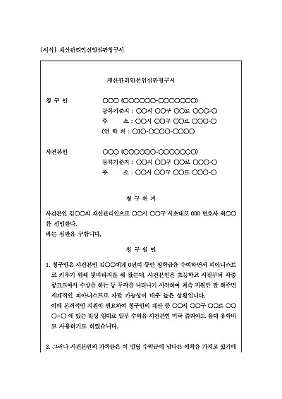 주요내용 : 미성년자의 보호를 위해 법원에 재산관리인선임청구시 사용되어지는 청구서 양식임. 단 무단전재 방지 목적으로 PDF 파일로 올리니구매하신 후 혹 원본 파일이 필요하신 분들은 톡이나 문자메일전화 등을 주시면 작성 방법 등에 대한 간단한 무료 상담과 함께 원본 파일을 보내드리도록 하겠습니다.