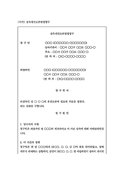 주요내용 : 상속개시 후 상속채권자 등 이해관계인이 상속재산이 유실, 훼손되지 않도록 상속재산의 관리를 위해 법원에 필요한 명령을 구할 목적으로 사용되어지는 신청서 청구서 양식임. 단 무단전재 방지목적으로 PDF 파일로 올리니, 구매하신 후 혹 원본 파일이 필요하신 분들은 톡이나 문자, 메일, 전화 등을 주시면 작성방법 등에 대한 간단한 무료상담과 함께 원본 파일을 보내드리도록 하겠습니다.