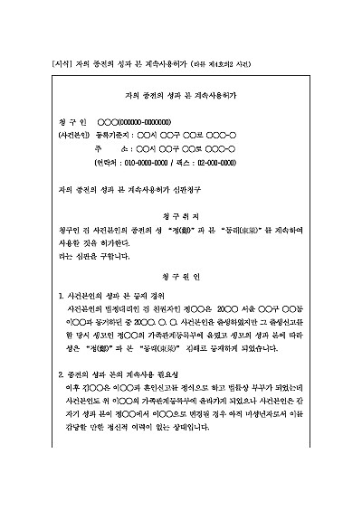 주요내용 : 자녀의 심리적 안정 등 복리를 위해 원래 사용하던 성과 본을 계속 사용하게 하기 위한 목적으로 사용되어지는 청구서 양식임. 단 무단전재 방지목적으로 PDF 파일로 올리니, 구매하신 후 혹 원본 파일이 필요하신 분들은 톡이나 문자, 메일, 전화 등을 주시면 작성방법 등에 대한 간단한 무료상담과 함께 원본 파일을 보내드리도록 하겠습니다.