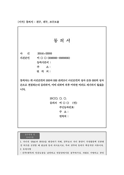 주요내용 : 자녀의 성(姓)과 본(本)을 변경하기 위해, 친부모나 자녀 본인이 가정법원에 성본변경 허가를 신청할 때 필요한 동의 의사표시 양식임. 단 무단전재 방지 목적으로 PDF 파일로 올리니, 구매하신 후 혹 원본 파일이 필요하신 분들은 톡이나 문자, 메일, 전화 등을 주시면 작성 방법 등에 대한 간단한 무료 상담과 함께 원본 파일을 보내드리도록 하겠습니다.