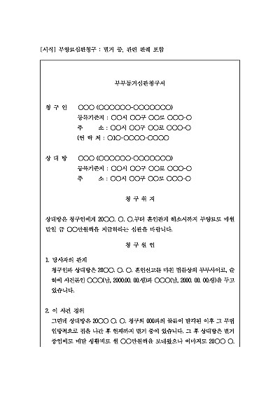 주요내용 : 부양의무를 이행하지 않는 사람을 상대로 법원에 생활비, 양육비 등 부양료 지급을 청구하며, 이혼 없이 별거 중이거나 부양받을 사람이 경제적 어려움이 있을 때 자신의 생활을 유지하기 위해 사용되어지는 청구서 양식임. 단 무단전재 방지 목적으로 PDF 파일로 올리니, 구매하신 후 혹 원본 파일이 필요하신 분들은 톡이나 문자, 메일, 전화 등을 주시면 작성 방법 등에 대한 간단한 무료 상담과 함께 원본 파일을 보내드리도록 하겠습니다.