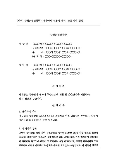 주요내용 부양의무를 이행하지 않는 사람을 상대로 법원에 생활비, 양육비 등 부양료 지급을 청구하며,  이혼 없이 별거 중이거나 부양받을 사람이 경제적 어려움이 있을 때 자신의 생활을 유지하기 위해 사용되어지는 청구서 양식임단 무단전재 방지 목적으로 PDF 파일로 올리니구매하신 후 혹 원본 파일이 필요하신 분들은 톡이나 문자메일전화 등을 주시면 작성 방법 등에 대한 간단한 무료 상담과 함께 원본 파일을 보내드리도록 하겠습니다.
