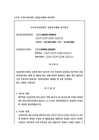 주요내용 :법원이 선임한 부재자 재산관리인이 관리하는 부재자 재산(특히 부동산)을 매매하는 등 일상적인 관리 범위를 넘어서는 행위를 하려 할 때 법원의 허가를 득하기 위한 목적으로 사용되어지는 신청서 양식임, . 단 무단전재 방지목적으로 PDF 파일로 올리니, 구매하신 후 혹 원본 파일이 필요하신 분들은 톡이나 문자, 메일, 전화 등을 주시면 작성방법 등에 대한 간단한 무료상담과 함께 원본 파일을 보내드리도록 하겠습니다.