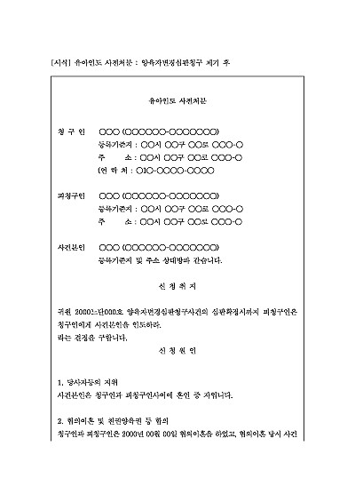 주요내용 : 소송이 진행되는 동안, 양육권을 가진 부모가 아이를 데려가지 못하게 하거나, 데려간 아이를 돌려보내지 않을 때 법원에 임시로 미성년 자녀를 인도하라는 명령을 구하기 위한 목적으로 사용되어지는 사전처분 양식임. 단 무단전재 방지 목적으로 PDF 파일로 올리니, 구매하신 후 혹 원본 파일이 필요하신 분들은 톡이나 문자, 메일, 전화 등을 주시면 작성 방법 등에 대한 간단한 무료 상담과 함께 원본 파일을 보내드리도록 하겠습니다.