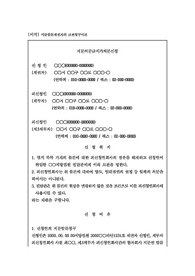 주요내용 : 채무자(회사 사원)의 지분을 압류한 채권자가 채무자의 재산을 처분하기 전에 자신의 채권을 확보하기 위해 법원에 지분환급청구권의 보전(보호)을 명하는 처분을 신청할 때 사용되어지는 신청서 양식임.단 무단전재 방지목적으로 PDF 파일로 올리니, 구매하신 후 혹 원본 파일이 필요하신 분들은 톡이나 문자, 메일, 전화 등을 주시면 작성방법 등에 대한 간단한 무료상담과 함께 원본 파일을 보내드리도록 하겠습니다.