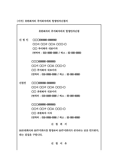 주요내용 : 유한회사가 주식회사로 합병될 때 법원의 인가를 받기 위한 목적으로 사용되어지는 신청서 양식임. 단 무단전재 방지목적으로 PDF 파일로 올리니구매하신 후 혹 원본 파일이 필요하신 분들은 톡이나 문자메일전화 등을 주시면 작성방법 등에 대한 간단한 무료상담과 함께 원본 파일을 보내드리도록 하겠습니다.