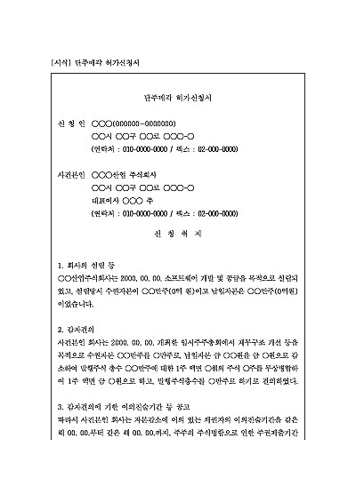 주요내용 : 주식의 병합, 무상감자 등으로 인해 발생하는 1주 미만의 '단주'를 주주들에게 현금으로 지급하기 위해, 회사가 법원으로부터 매각을 허락받기 위한 목적으로 사용되어지는 신청서 양식임. 단 무단전재 방지목적으로 PDF 파일로 올리니, 구매하신 후 혹 원본 파일이 필요하신 분들은 톡이나 문자, 메일, 전화 등을 주시면 작성방법 등에 대한 간단한 무료상담과 함께 원본 파일을 보내드리도록 하겠습니다.