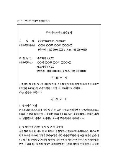 주요내용 주주가 합병, 영업양수도 등 주요 결정에 반대하며 자신의 주식을 회사에 매수해달라고 청구했는데, 주주와 회사 간 협의로 적정 매수가액이 결정되지 않을 때, 주주가 법원에 '우리 주식을 얼마에 사가라'고 가격 결정을 요구하기 위해 제출하는 신청서 약식임단 무단전재 방지목적으로 PDF 파일로 올리니구매하신 후 혹 원본 파일이 필요하신 분들은 톡이나 문자메일전화 등을 주시면 작성방법 등에 대한 간단한 무료상담과 함께 원본 파일을 보내드리도록 하겠습니다.