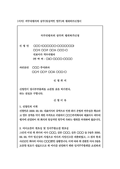주요내용 : 이사 직무집행정지 가처분 등으로 선임된 직무대행자가 회사의 일상적인 업무(상무) 범위를 넘어서는 중대한 행위(예: 임원선임, 회사 매각 등)를 하기 위해 법원에 그 허가를 받기 위한 목적으로 사용되어지는 신청서 양식임. 단 무단전재 방지 목적으로 PDF 파일로 올리니, 구매하신 후 혹 원본 파일이 필요하신 분들은 톡이나 문자, 메일, 전화 등을 주시면 작성 방법 등에 대한 간단한 무료 상담과 함께 원본 파일을 보내드리도록 하겠습니다.
