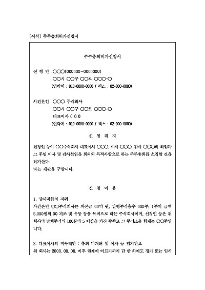 주요내용 회사의 이사회가 소수주주의 임시주주총회 소집 요구에 응하지 않을 때, 상법 제366조에 근거하여 발행주식총수의 100분의 3 이상을 소유한 주주가 법원에 임시총회 소집을 신청하고 허가를 받기 위한 목적으로 사용되어지는 신청서 양식임단 무단전재 방지목적으로 PDF 파일로 올리니구매하신 후 혹 원본 파일이 필요하신 분들은 톡이나 문자메일전화 등을 주시면 작성방법 등에 대한 간단한 무료상담과 함께 원본 파일을 보내드리도록 하겠습니다.