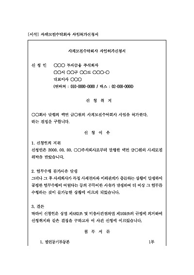 주요내용 : 사채모집 업무를 위탁받은 회사가 법원의 허가를 받아 그 직무를 그만두기 위한 목적으로 사용되어지는 신청서 양식임. 단 무단전재 방지목적으로 PDF 파일로 올리니, 구매하신 후 혹 원본 파일이 필요하신 분들은 톡이나 문자, 메일, 전화 등을 주시면 작성방법 등에 대한 간단한 무료상담과 함께 원본 파일을 보내드리도록 하겠습니다.