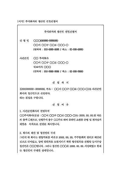 주요내용 : 회사가 해산된 후 법인격을 소멸시키기 위한 청산 절차를 진행할 '청산인'을 법원에 신청하여 선임해달라고 요청할 때 사용되어지는 신청서 양식임. 단 무단전재 방지목적으로 PDF 파일로 올리니, 구매하신 후 혹 원본 파일이 필요하신 분들은 톡이나 문자, 메일, 전화 등을 주시면 작성방법 등에 대한 간단한 무료상담과 함께 원본 파일을 보내드리도록 하겠습니다.