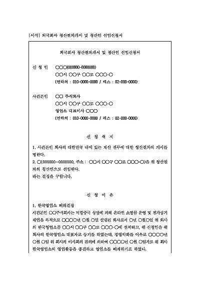 주요내용 대한민국 내 영업소를 폐쇄하는 외국회사가 국내에 남아있는 채권·채무 관계를 정리하고 잔여 재산을 처리하기 위해 법적인 청산 절차를 밟는 과정에서 법원에 청산 절차의 시작을 알리고 그 업무를 수행할 청산인을 지정해 줄 것을 요청할 목적으로 사용되어지는 신청서 양식임단 무단전재 방지목적으로 PDF 파일로 올리니구매하신 후 혹 원본 파일이 필요하신 분들은 톡이나 문자메일전화 등을 주시면 작성방법 등에 대한 간단한 무료상담과 함께 원본 파일을 보내드리도록 하겠습니다.