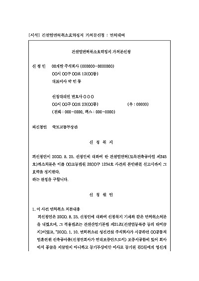 주요내용 : 건설업 면허가 취소되었을 때, 그 취소 처분이 확정되기 전까지 면허 취소의 효력(사업을 할 수 없게 되는 효력)을 법원으로부터 일시적으로 멈춰달라고 요청할 목적으로 사용되어지는 신청서 양식임. 단 무단전재 방지목적으로 PDF 파일로 올리니, 구매하신 후 혹 원본 파일이 필요하신 분들은 톡이나 문자, 메일, 전화 등을 주시면 작성방법 등에 대한 간단한 무료상담과 함께 원본 파일을 보내드리도록 하겠습니다.