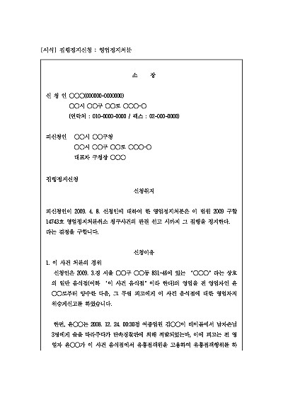 주요내용 행정청의 처분으로 인해 회복하기 어려운 손해가 발생할 우려가 있을 때, 행정소송이나 행정심판에서 승소할 때까지 처분의 효력이나 집행, 절차의 속행을 잠정적으로 멈추는 법원의 결정을 구하기 위한 목적으로 사용되어지는 양식임단 무단전재 방지목적으로 PDF 파일로 올리니구매하신 후 혹 원본 파일이 필요하신 분들은 톡이나 문자메일전화 등을 주시면 작성방법 등에 대한 간단한 무료상담과 함께 원본 파일을 보내드리도록 하겠습니다.