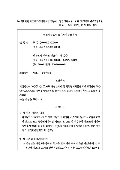 주요내용 행정처분효력정지가처분신청은 행정청의 처분(: 영업정지, 면허취소 등)을 받은 사람이 그 처분이 위법하다는 판단하에 행정소송을 제기하기 전에, 본안 소송 판결 전까지 처분의 효력이나 집행을 잠시 멈춰달라고 법원에 요청할 때 사용되어지는 임시적 구제절차 양식임단 무단전재 방지목적으로 PDF 파일로 올리니구매하신 후 혹 원본 파일이 필요하신 분들은 톡이나 문자메일전화 등을 주시면 작성방법 등에 대한 간단한 무료상담과 함께 원본 파일을 보내드리도록 하겠습니다.