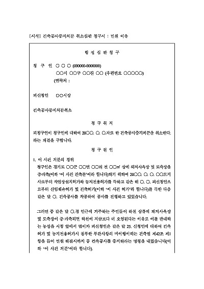 주요내용 : 행정기관으로부터 받은 공사중지 명령이 위법 또는 부당함을 이유로 그 처분의 취소를 구하기 위한 목적으로 사용되어지는 양식임. 단 무단전재 방지목적으로 PDF 파일로 올리니, 구매하신 후 혹 원본 파일이 필요하신 분들은 톡이나 문자, 메일, 전화 등을 주시면 작성방법 등에 대한 간단한 무료상담과 함께 원본 파일을 보내드리도록 하겠습니다.