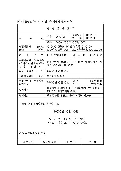주요내용 : 위법 부당한 행정처분으로 인해 권리나 이익을 침해당한 국민이 처분이 있음을 안날부터 90일 또는 처분이 있었던 날부터 180일 이내에 그 처분의 취소 또는 변경이나 무효확인 구하기 위한 행정절차를 진행하기 위해 사용되어지는 신청서 양식임단 무단전재 방지목적으로 PDF 파일로 올리니구매하신 후 혹 원본 파일이 필요하신 분들은 톡이나 문자메일전화 등을 주시면 작성방법 등에 대한 간단한 무료상담과 함께 원본 파일을 보내드리도록 하겠습니다.