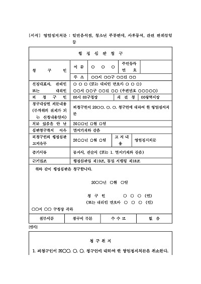 주요내용 : 위법 부당한 행정처분으로 인해 권리나 이익을 침해당한 국민이 처분이 있음을 안날부터 90일 또는 처분이 있었던 날부터 180일 이내에 그 처분의 취소 또는 변경이나 무효확인 구하기 위한 행정절차를 진행하기 위해 사용되어지는 신청서 양식임단 무단전재 방지목적으로 PDF 파일로 올리니구매하신 후 혹 원본 파일이 필요하신 분들은 톡이나 문자메일전화 등을 주시면 작성방법 등에 대한 간단한 무료상담과 함께 원본 파일을 보내드리도록 하겠습니다.