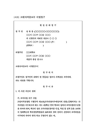 주요내용 : 교원자격증을 교부받을 요건을 충족하였음에도 불구하고 발급 권한이 있는 대학총장 등 기관이 정당한 사유없이 그 발급을 거부하거나 지연할 때 그 의무 이행을 강제하기 위한 목적으로 사용되어지는 양식임. 단 무단전재 방지목적으로 PDF 파일로 올리니, 구매하신 후 혹 원본 파일이 필요하신 분들은 톡이나 문자, 메일, 전화 등을 주시면 작성방법 등에 대한 간단한 무료상담과 함께 원본 파일을 보내드리도록 하겠습니다.