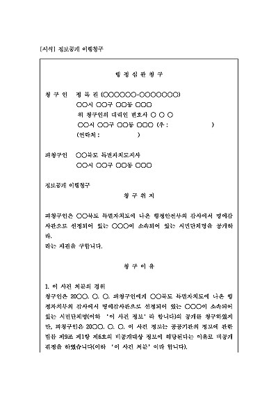 주요내용 : 위법 부당한 행정처분으로 인해 권리나 이익을 침해당한 국민이 처분이 있음을 안날부터 90일 또는 처분이 있었던 날부터 180일 이내에 그 처분의 취소 또는 변경이나 무효확인 구하기 위한 행정절차를 진행하기 위해 사용되어지는 신청서 양식임단 무단전재 방지목적으로 PDF 파일로 올리니구매하신 후 혹 원본 파일이 필요하신 분들은 톡이나 문자메일전화 등을 주시면 작성방법 등에 대한 간단한 무료상담과 함께 원본 파일을 보내드리도록 하겠습니다.