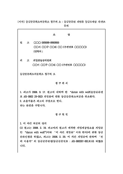 주요내용 : 게임물관리위원회 등 행정청이 게임물에 대해 내린 등급분류결정(예: 청소년이용불가 등)을 '취소'하는 처분을, 해당 처분이 위법하거나 부당하다고 판단될 그 취소를 구하기 위한 목적으로 사용되어지는 소장 양식임. 단 무단전재 방지목적으로 PDF 파일로 올리니, 구매하신 후 혹 원본 파일이 필요하신 분들은 톡이나 문자, 메일, 전화 등을 주시면 작성방법 등에 대한 간단한 무료상담과 함께 원본 파일을 보내드리도록 하겠습니다.