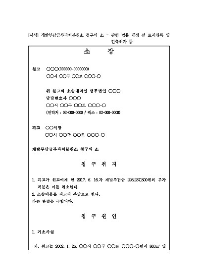 주요내용 행정청이 개발사업 시행자에게 위법하게 부과한 부담금 처분의 취소나 변경을 구하기 위한 목적으로 사용되어지는 소장 양식임단 무단전재 방지 목적으로 PDF 파일로 올리니구매하신 후 혹 원본 파일이 필요하신 분들은 톡이나 문자메일전화 등을 주시면 작성 방법 등에 대한 간단한 무료 상담과 함께 원본 파일을 보내드리도록 하겠습니다.