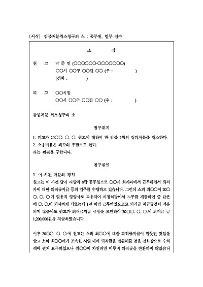 주요내용 : 공무원의 직무수행 등과 관련하여 받은 징계처분이 위법 또는 부당함을 이유로 당해 처분의 취소 등을 구하기 위한 목적으로 사용되어지는 소장 양식임 . 단 무단전재 방지목적으로 PDF 파일로 올리니구매하신 후 혹 원본 파일이 필요하신 분들은 톡이나 문자메일전화 등을 주시면 작성방법 등에 대한 간단한 무료상담과 함께 원본 파일을 보내드리도록 하겠습니다.