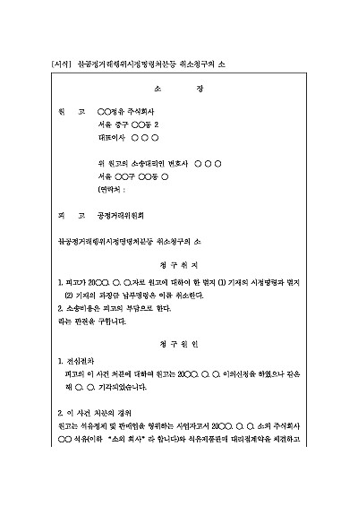주요내용 : 공정거래위원회(공정위)가 불공정거래행위를 한 사업자에게 내린 '시정명령'이라는 행정처분이 위법하다고 판단될 때, 당해 처분의 취소를 구하기 위한 목적으로 사용되어지는 소장 양식임. 단 무단전재 방지목적으로 PDF 파일로 올리니, 구매하신 후 혹 원본 파일이 필요하신 분들은 톡이나 문자, 메일, 전화 등을 주시면 작성방법 등에 대한 간단한 무료상담과 함께 원본 파일을 보내드리도록 하겠습니다.