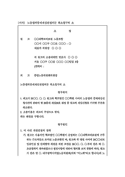 주요내용 : 노동조합과 사용자 간의 분쟁(노동쟁의)을 노동위원회가 중재하여 내린 결정(중재재정)에 대해 불복하는 당사자가 위법하거나 월권에 해당한다고 판단될 때, 중앙노동위원회의 재심결정까지 불복하여 행정법원에 소송을 제기해 그 효력을 무효로 해달라고 요구할 때 사용되어지는 소장 양식임. 단 무단전재 방지목적으로 PDF 파일로 올리니, 구매하신 후 혹 원본 파일이 필요하신 분들은 톡이나 문자, 메일, 전화 등을 주시면 작성방법 등에 대한 간단한 무료상담과 함께 원본 파일을 보내드리도록 하겠습니다.