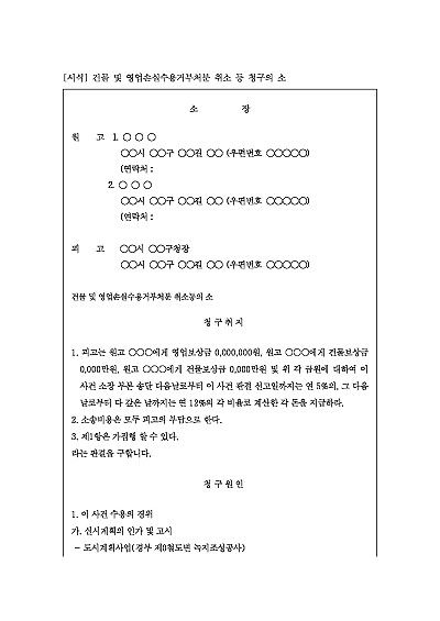 주요내용 : 공익사업 등으로 인해 자신의 건물 소유권이나 영업권이 침해될 때, 사업시행자나 행정청이 정당한 사유 없이 손실보상(건물 보상, 영업 보상 등)을 거부하는 처분을 했고, 이에 대해 **그 거부 처분이 위법하다며 취소를 구하기 위한 목적으로 사용되어지는 소장 양식임. 단 무단전재 방지목적으로 PDF 파일로 올리니, 구매하신 후 혹 원본 파일이 필요하신 분들은 톡이나 문자, 메일, 전화 등을 주시면 작성방법 등에 대한 간단한 무료상담과 함께 원본 파일을 보내드리도록 하겠습니다.