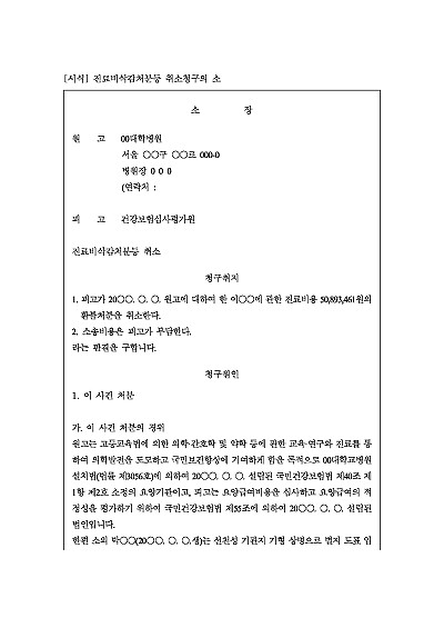 주요내용 : 건강보험심사평가원이 의료기관의 진료비 청구에 대해 심사 후 '삭감' 처분(공단 부담금 지급 거부 또는 환수)을 내렸을 때, 당해 처분의 위법 또는 부당함을 이유로 그 취소 등을 구할 목적으로 사용되어지는 소장 양식임. 단 무단전재 방지목적으로 PDF 파일로 올리니, 구매하신 후 혹 원본 파일이 필요하신 분들은 톡이나 문자, 메일, 전화 등을 주시면 작성방법 등에 대한 간단한 무료상담과 함께 원본 파일을 보내드리도록 하겠습니다.
