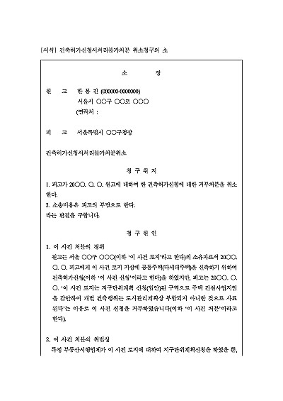 주요내용 : 건축허가 신청 후 당해 신청이 거부되었을 때 거부처분이 위법 또는 부당함을 이유로 그 취소를 구하기 위한 목적으로 사용되어지는 양식임. 단 무단전재 방지목적으로 PDF 파일로 올리니구매하신 후 혹 원본 파일이 필요하신 분들은 톡이나 문자메일전화 등을 주시면 작성방법 등에 대한 간단한 무료상담과 함께 원본 파일을 보내드리도록 하겠습니다.