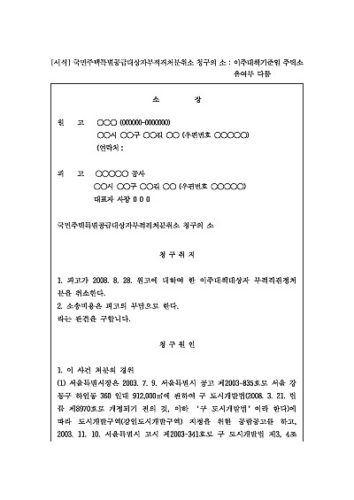 주요내용 : 특별공급 대상자 자격을 충족하지 못해 당첨이 취소된 사람이 자신의 자격이 유효함을 다투기 위한 목적으로 사용되어지는 소장 양식임. 단 무단전재 방지목적으로 PDF 파일로 올리니, 구매하신 후 혹 원본 파일이 필요하신 분들은 톡이나 문자, 메일, 전화 등을 주시면 작성방법 등에 대한 간단한 무료상담과 함께 원본 파일을 보내드리도록 하겠습니다.