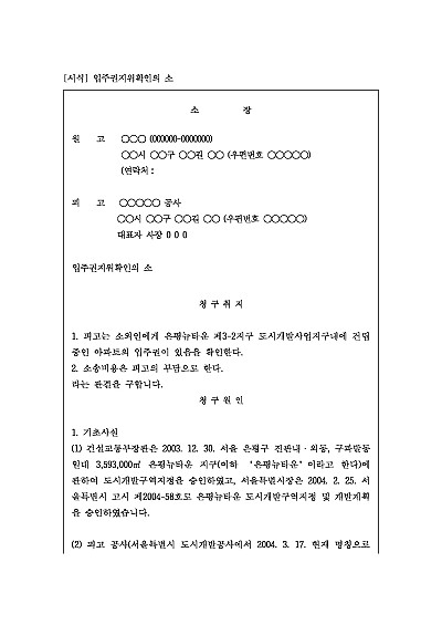주요내용 : 재개발, 재건축 등 정비사업 과정에서 자신이 정당한 조합원 자격이 있음을 확인하기 위해 사용되어지는 소장 양식임. 단 무단전재 방지목적으로 PDF 파일로 올리니, 구매하신 후 혹 원본 파일이 필요하신 분들은 톡이나 문자, 메일, 전화 등을 주시면 작성방법 등에 대한 간단한 무료상담과 함께 원본 파일을 보내드리도록 하겠습니다.