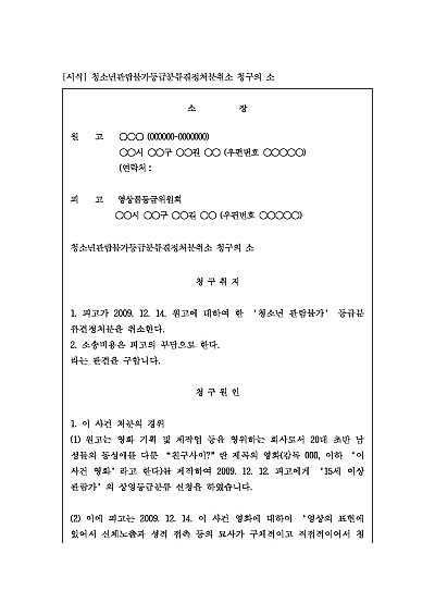 주요내용 : 영상물등급위원회가 특정 영상물(영화, 게임 등)에 대해 '청소년 관람불가'(청불) 등급을 내린 처분이 부당하다고 판단될 때, 당해 처분의 취소를 구할 목적으로 사용되어지는 소장 양식임. 단 무단전재 방지목적으로 PDF 파일로 올리니, 구매하신 후 혹 원본 파일이 필요하신 분들은 톡이나 문자, 메일, 전화 등을 주시면 작성방법 등에 대한 간단한 무료상담과 함께 원본 파일을 보내드리도록 하겠습니다.