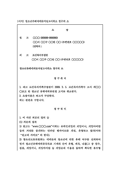 주요내용 특정 매체물(영화, 게임, 음반, 웹사이트 등)이 '청소년유해매체물'로 지정된 행정처분을 받은 경우, 그 지정이 부당하다고 판단될 때 당해 처분의 취소를 구할 목적으로 사용되어지는 소장 양식임. 단 무단전재 방지목적으로 PDF 파일로 올리니구매하신 후 혹 원본 파일이 필요하신 분들은 톡이나 문자메일전화 등을 주시면 작성방법 등에 대한 간단한 무료상담과 함께 원본 파일을 보내드리도록 하겠습니다.