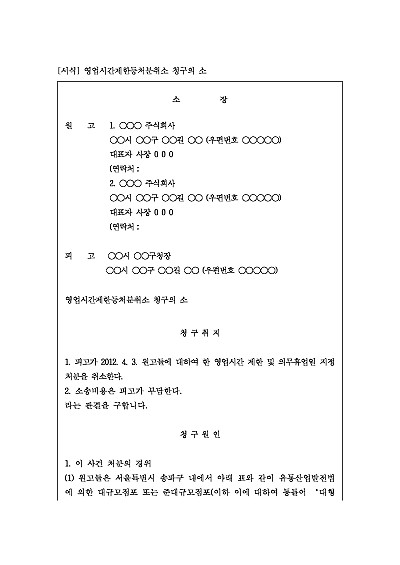 주요내용 : 지방자치단체가 대형마트나 SSM 등에 내린 심야영업 제한 및 의무휴업일 지정 처분이 위법하다며 그 취소를 구하기 위한 목적으로 사용되어지는 소장 양식임. 단 무단전재 방지목적으로 PDF 파일로 올리니, 구매하신 후 혹 원본 파일이 필요하신 분들은 톡이나 문자, 메일, 전화 등을 주시면 작성방법 등에 대한 간단한 무료상담과 함께 원본 파일을 보내드리도록 하겠습니다.