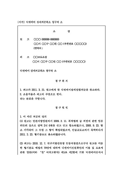 주요내용 : 범죄 수사 및 예방을 위해 법률에 따라 이루어진DNA 시료 채취 처분이 위법하다고 판단될 때, 당해 처분의 취소를 구하기 위한 목적으로 사용되어지는 소장 양식임. 단 무단전재 방지목적으로 PDF 파일로 올리니, 구매하신 후 혹 원본 파일이 필요하신 분들은 톡이나 문자, 메일, 전화 등을 주시면 작성방법 등에 대한 간단한 무료상담과 함께 원본 파일을 보내드리도록 하겠습니다.